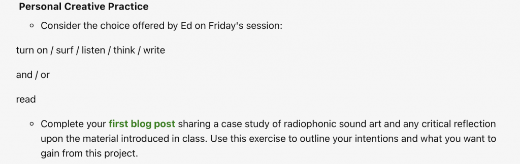 In the first session we discussed radiophonic sound art. As i understand Radiophonic sound art embodies the same qualities as a Radio Drama or documentary but extends further with the use of sonic abstractions.