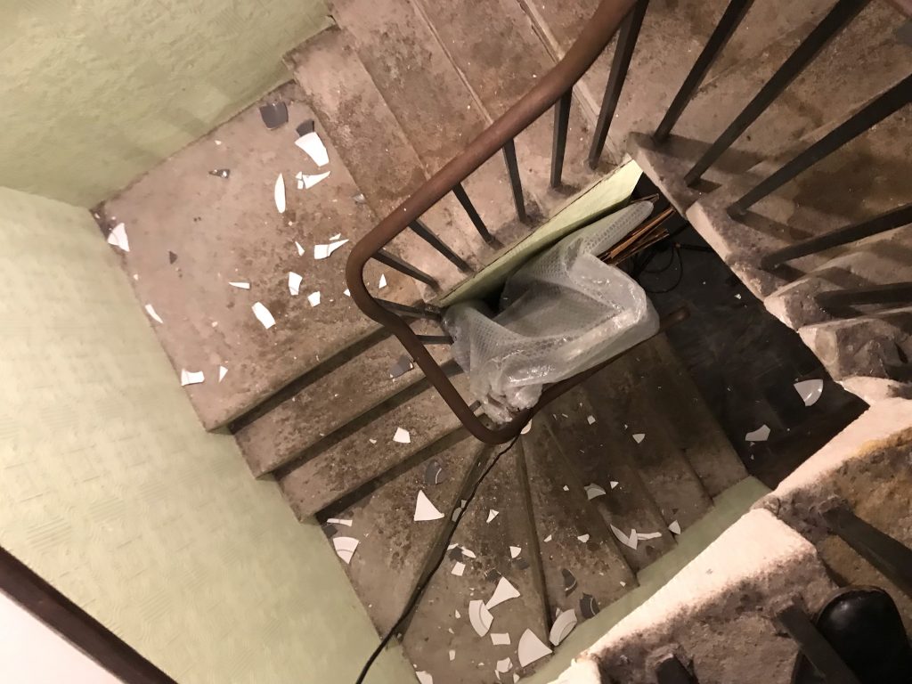 I would like to explore the topic of self destruction in this project. I will do this by recording myself destroying different items e.g. smashing up a chair with a sledge hammer; throwing cups, plates, sauce-pans … down the stairs. Tearing up books etc etc. I will objectify myself in this applying the patriarchal notion that a woman is a domestic object (although this is not the main or only point). The point is that the house is destroying its-self and therefore i am part of the house. The sound will not sync with the visual however it will follow the pacing and respond. In the moments of silence before the explosions i am thinking about using the sound of some kind of bell or gong type instrument. My idea was to use an instrument traditionally used to create a meditative frequency so that the audience is lulled in and out of comfort and discomfort.