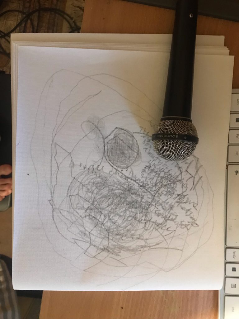 I then completed anther ritual where i did four takes writing automatically to the visual on paper. I rested the Microphone on the table and took some textured paper. I then recorded four takes. I the first take I drew a spiral increasing gaining more momentum as it went outwards. For the second i drew the same spiral inward. For the third I wrote automatically and for the fourth I responded to the other three. I then altered these with reversing and time stretching and EQ.