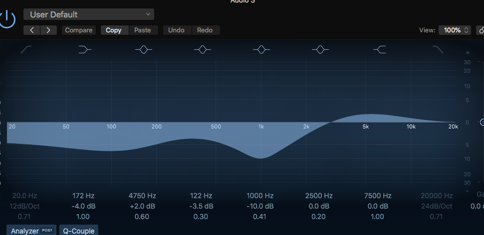 I used the EQ tool on each audio-file and put a highpass filter to cut out some of the background noise and make the sound more compressed. And equally the alternative if there was unwanted low frequency sounds.